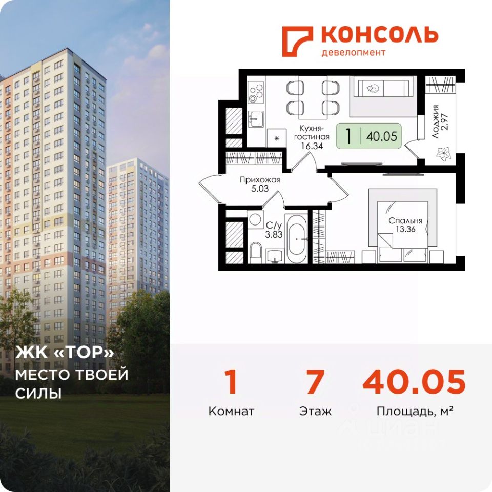 Продается однокомнатная квартира 55 без отделки в ЖК ''ТОР'' площадью 40.05 на 7 этаже от застройщика Консоль девелопмент.