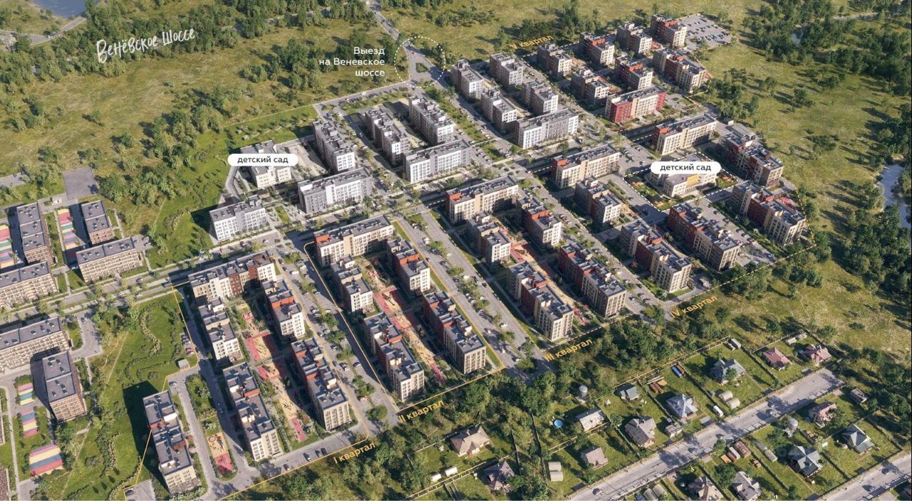 Это большой девелоперской проект, который будет строиться по принципу комплексного развития территории. Помимо жилых домов будут созданы объекты городской инфраструктуры: 2 детских сада, магазины и полезные сервисы. Район формируют несколько кварталов, связанных между собой улицами. Каждый квартал состоит из 5-8 шестиэтажных домов. Они образуют закрытый безопасный двор-сквер без машин со своими спортивными и детскими площадками, прогулочными дорожки и местами для отдыха. Сочетание неплотной посадки домов и низкой этажности дает ощущение свободы и легкости.