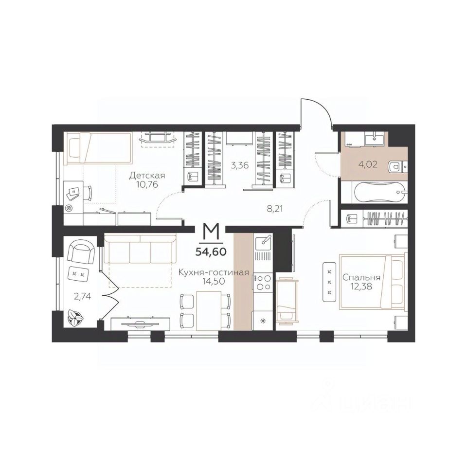 Общая площадь54,6 м2