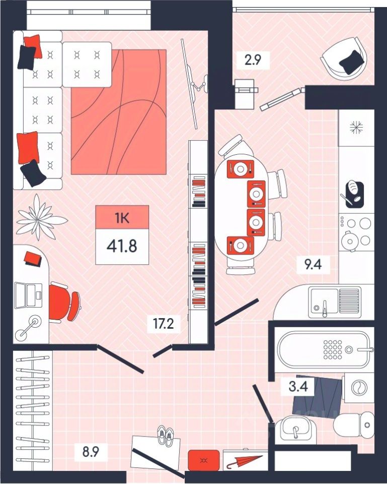 Продаётся 1-комнатная квартира в строящемся доме (Дом 20), срок сдачи: I-кв. 2026, общей площадью 41.8 кв.м., на 14 этаже. Расположение, транспортная доступность Новый жилой комплекс ''Юго-Восточный'' строится в Туле, в 3,5 км от центра города. Благодаря удачным транспортным развязкам, автолюбители смогут доехать до центральных кварталов примерно за 5 10 минут, составив наиболее быстрый и удобный маршрут с учетом загруженности дорог. Проблем с мобильностью не возникнет и у пассажиров общественного транспорта. Рядом с домом расположены остановки автобусов и маршрутных такси, которые быстро довезут до любого района города. Так, чтобы добраться до центра, следует дойти пешком до остановки ''Медтехника'', где останавливается маршрутное такси, доезжающее до центральных кварталов всего за 7 8 минут. Инфраструктура Район, где возводится новый жилой комплекс, активно застраивается, и сеть инфраструктуры сов временем будет расширяться. Но и сейчас все, что нужно для комфортной жизни в городе, находится недалеко от жилого комплекса. В шаговой доступности расположены продуктовые магазины: ''Виктория'', ''Овощи-фрукты'', Магазин рыбы и мяса птицы, магазин мяса и колбас ''У Максима'', супермаркеты ''Дикси'', ''Пятерочка'', ''SPAR''. Неподалеку находится гипермаркет ''Линия'', крупный торговый центр, в котором расположены отделения банков, гипермаркет ''Глобус'', салон оптики, мебельный магазин ''Столплит'', зоомагазин ''Четыре лапы'' и пр. В соседнем здании находится строительный гипермаркет ''Леруа Мерлен'', за ним крупный магазин товаров для спорта, туризма и активного отдыха ''Декатлон''.Недалеко от жилого комплекса открыты кафе и рестораны: кофейня ''Bonape'', пиццерия ''Культура'', кафе ''Вкуснов'', кафе быстрого обслуживания ''Rapido'', ресторан ''У фонтана'' и пр.В районе есть аптеки, поликлиники, диагностические центры. В шаговой доступности от жилого комплекса расположено несколько детских садиков, в том числе, садик комбинированного вида ''Алые паруса''. Есть дошкольные отделения, входящие в состав образовательных центров, Центры развития ребенка. Поблизости расположены средние школы, в том числе, школа для детей с ОВЗ. Рядом с жилым комплексом находится Тульская Духовная Семинария и Суворовское училище. Надежность застройщик: достраивает объект ООО Ин-Групп.АрхитектураЖилой комплекс будет представлен 19 монолитно-кирпичными корпусами переменной этажности, выполненными в едином архитектурном стиле. При строительстве ЖК ''Юго-Восточный'' применяются современные материалы высокого качества, которые обеспечивают надежность домов и комфортный микроклимат в помещениях. Каждая секция оснащается современными лифтами. Помещения общего пользования отделываются экологичными материалами. Квартиры предлагаются однокомнатные (от 43,9 кв. м), двухкомнатные (от 45,8 кв. м), трехкомнатные (от 60,4 кв. м) и четырехкомнатные (от 87,2 кв. м), а также уютные студии (от 28,9 кв. м).На внутренней территории проводится комплексное благоустройство: озеленение, организация игровых площадок, мест для отдыха и зан