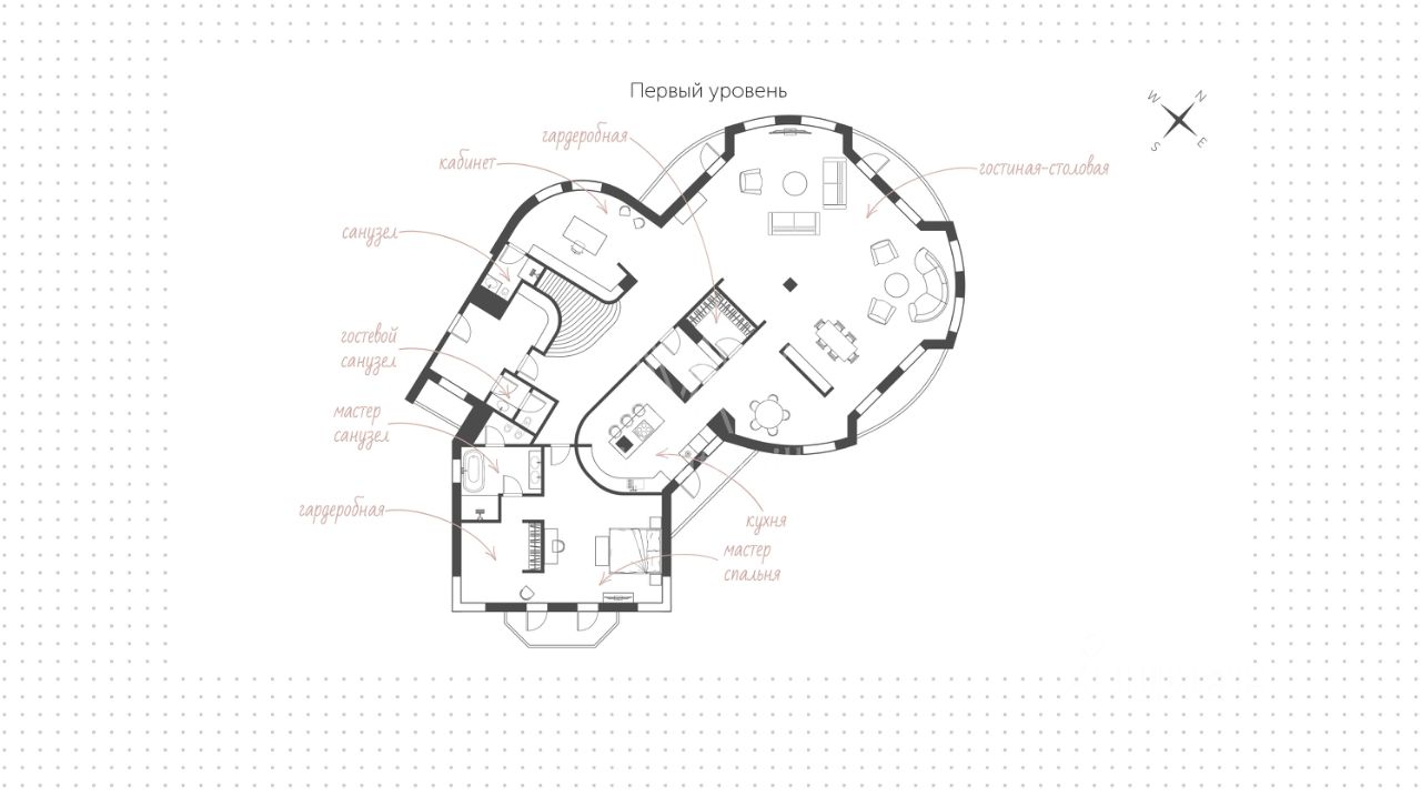Планировка включает гостиную-столовую с обеденной зоной и камином, кухню, мастер-спальню с собственной ванной комнатой и гардеробной, кабинет, гостевой санузел, пять балконов, гардеробную и холл на первом уровне.