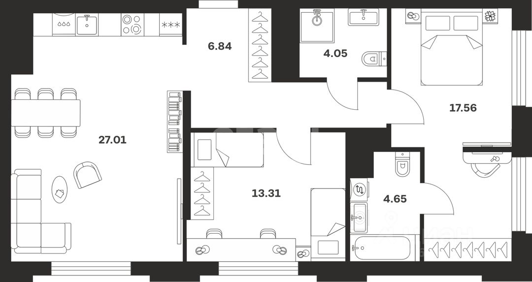 Почему эта квартира вызывает вспышку ''давай берём''? Момент 1. ''Вау'' уже на входе Кухня-гостиная — место, где собираются самые приятные события: семья, друзья и вы, пытающийся закрыть холодильник, не глядя. Панорамные окна + высокие потолки — ощущение, что жизнь наконец решила вас уважать. Момент 2. Пространство личного спокойствия Две спальни. Одна — мастер, свой санузел, кабинет и гардеробная.