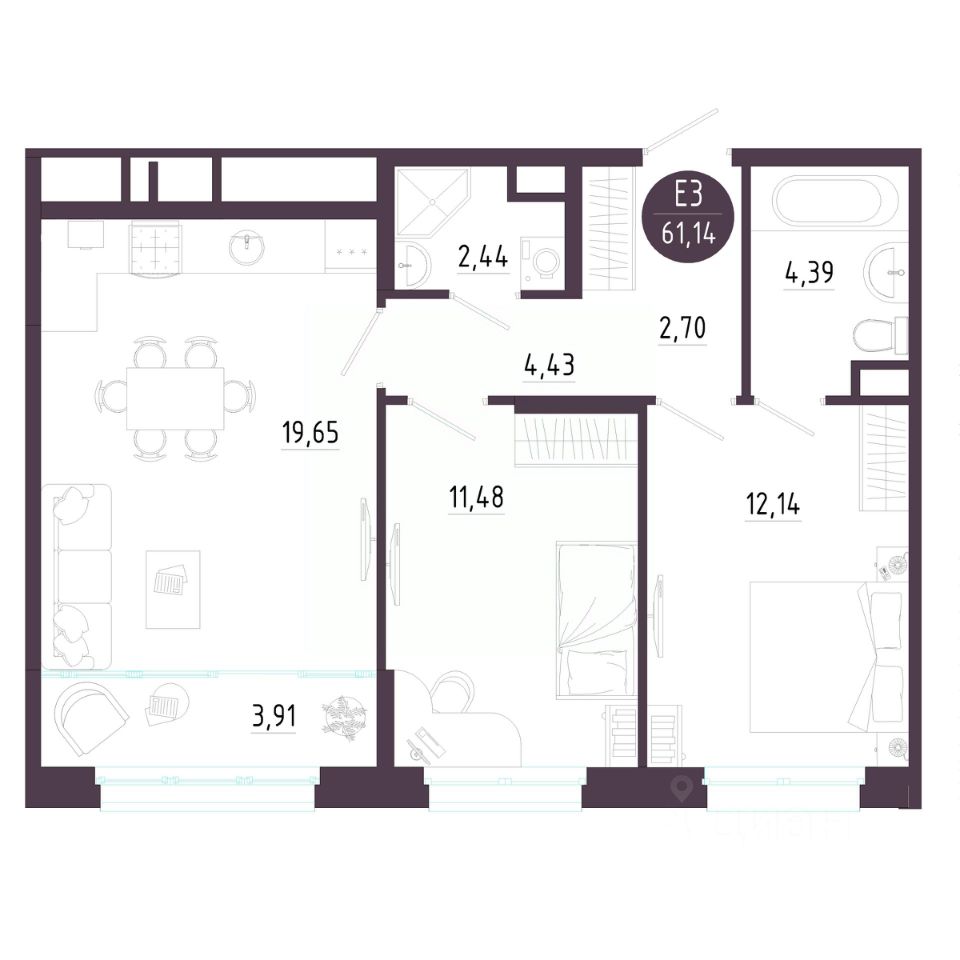 Общая площадь61,14 м2