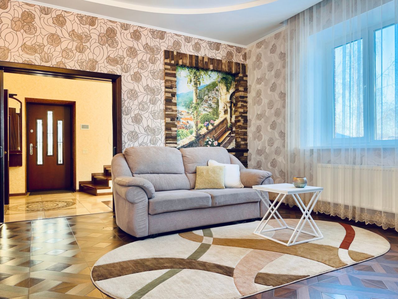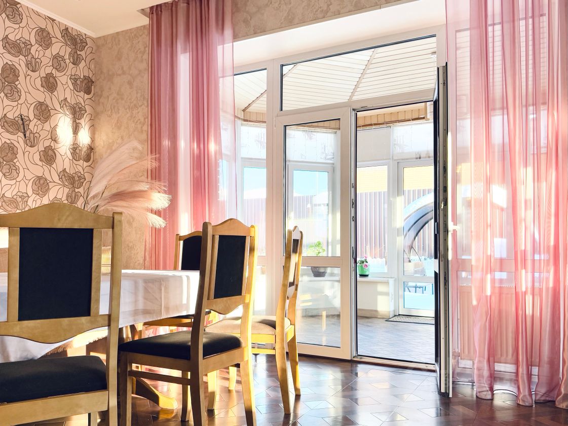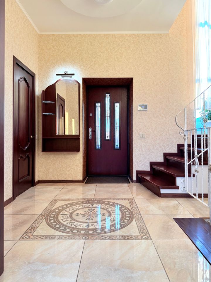 Планировка: Первый этаж: прихожая с гардеробной, кухня-гостиная, большая закрытая терраса с выходом в зону барбекю, санузел с душем. По всей площади теплый пол, включая террасу. Второй этаж: три спальни, санузел с ванной и теплым полом, гардеробная. Техэтаж : бойлерная, прачечная, санузел с душем, мастерская, холодная комната для хранения продуктов и вин. Высота потолка 2,25 м. Вход на техэтаж с улицы и из дома.