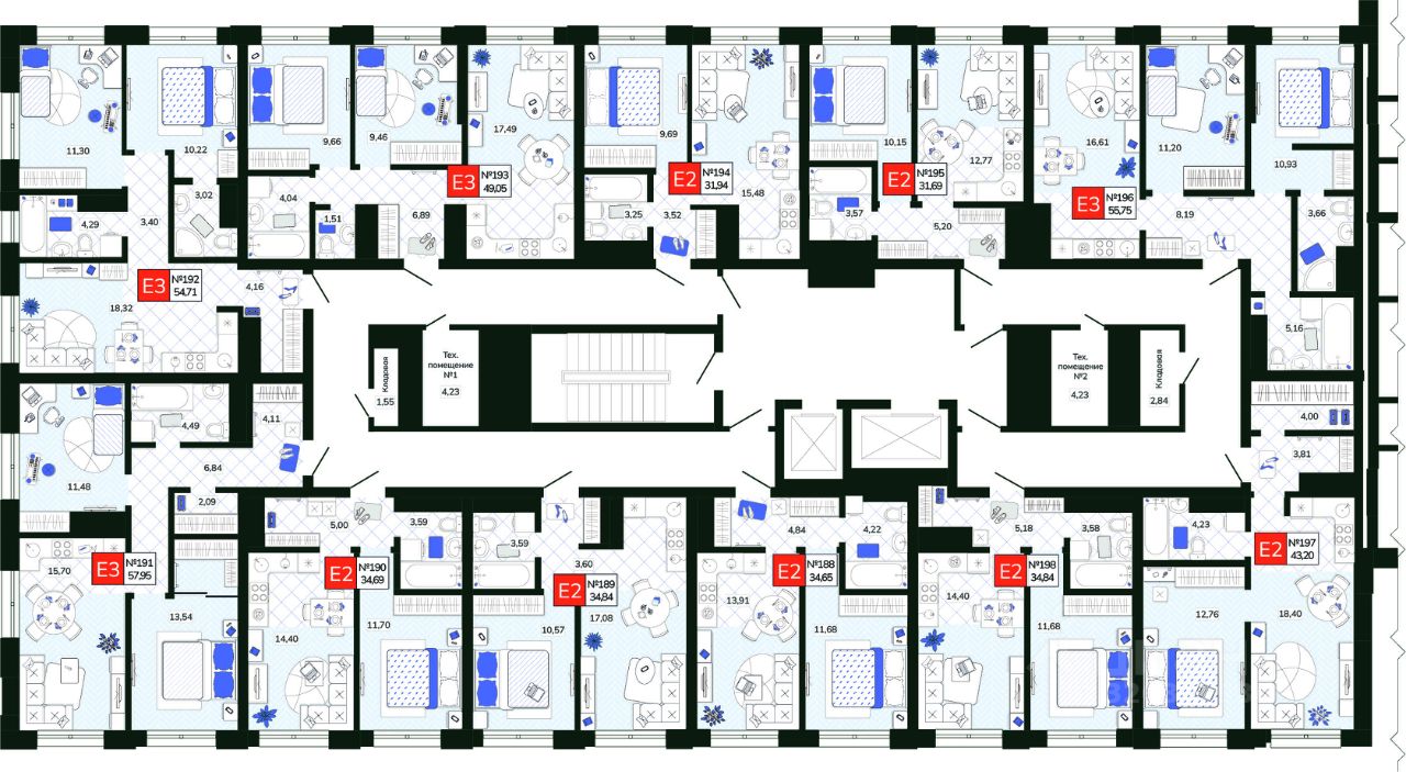 - Системы водоснабжения и отопления разведены горизонтально в конструкции пола