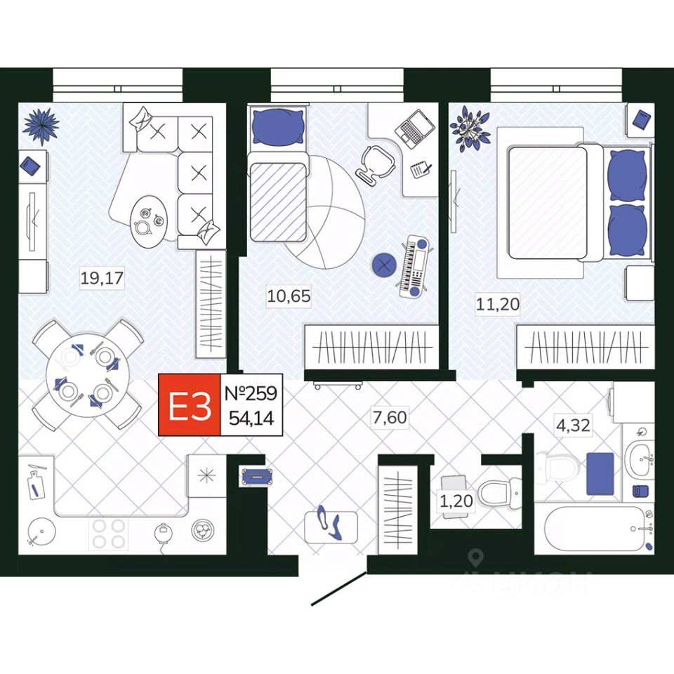 Общая площадь54,14 м2