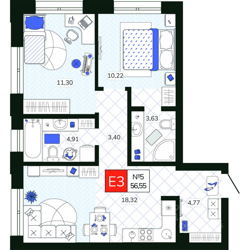 Общая площадь56,55 м2