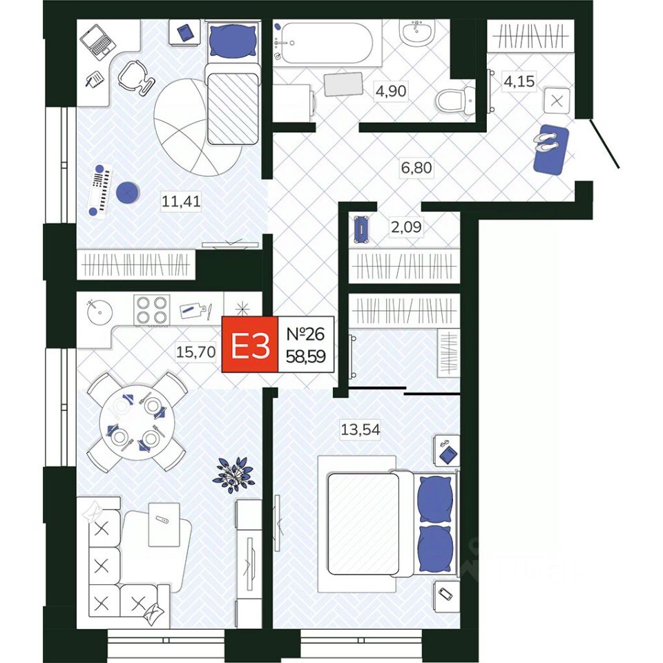 Общая площадь58,59 м2