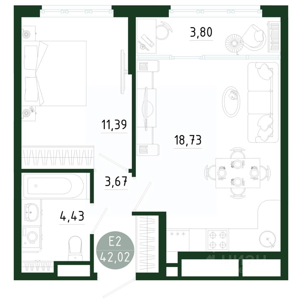 Общая площадь42,02 м2