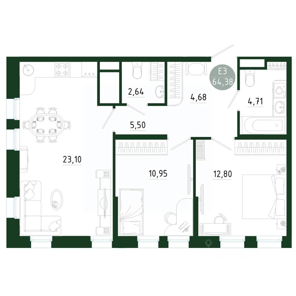 Общая площадь64,38 м2