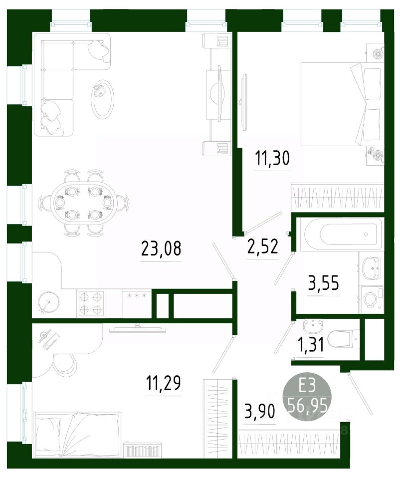Общая площадь56,95 м2