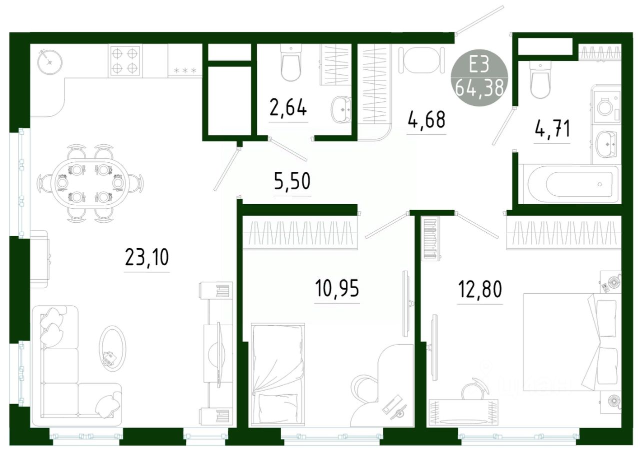 Общая площадь64,38 м2