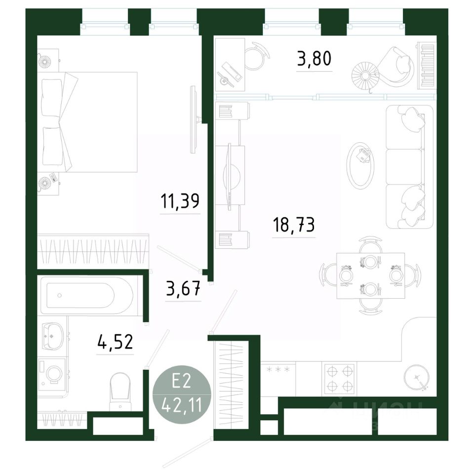 Общая площадь42,11 м2