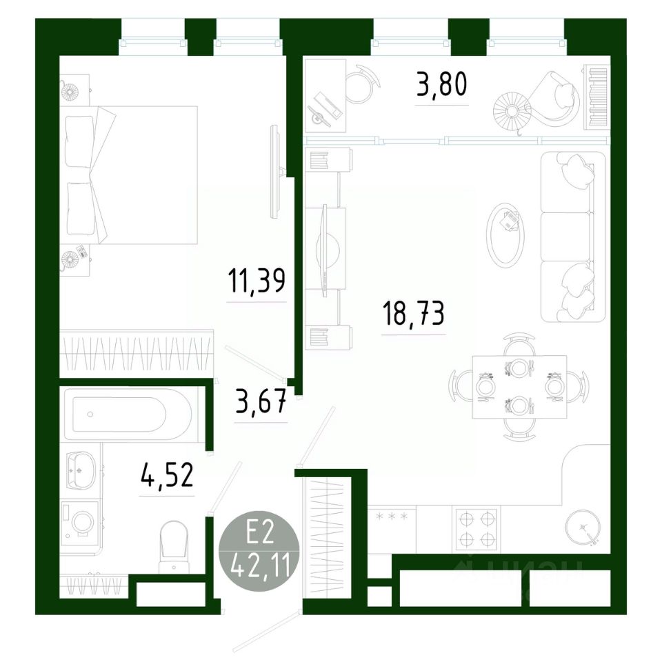 Общая площадь42,11 м2