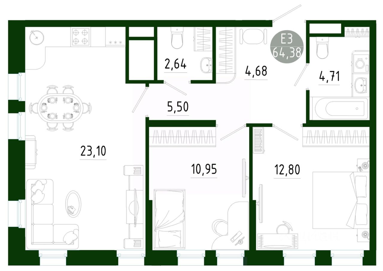 Общая площадь64,38 м2